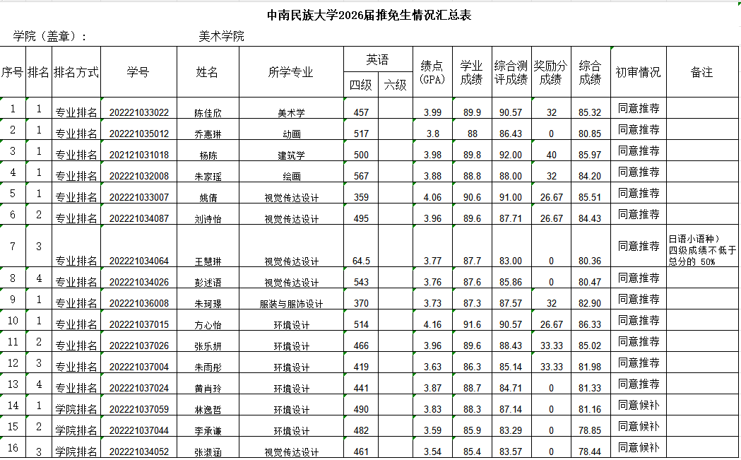 鏍規嵁銆婁腑鍗楁皯鏃忓ぇ瀛︽帹鑽愪紭縐搴斿眾鏈姣曚笟鐢熷厤璇曟敾璇葷澹浣嶇爺絀剁敓宸ヤ綔瀹炴柦鍔炴硶錛堜慨璁級銆?姘戝ぇ鏁欏銆?024銆?9 鍙鳳級銆佹湰縐戠敓闄㈠彂(鍏充簬鍋氬ソ鎺ㄨ崘2026灞婁紭縐鏈姣曚笟鐢熷厤璇曟敾璇葷澹浣嶇爺絀剁敓鐨勫伐浣滈氱煡錛夊拰銆婄編鏈闄?026灞婃湰縐戠敓鎺ㄥ厤宸ヤ綔瀹炴柦緇嗗垯銆嬬殑瑙勫畾瑕佹眰錛屾垜闄㈤伒寰叕寮銆佸叕騫熾佸叕姝g殑鍘熷垯錛岀粡瀛︾敓涓漢鐢寵錛屽闄㈠鐢寵鍏嶈瘯鏀昏紜曞+瀛︿綅鐨?026灞婃瘯涓氱敓緇忚繃鎶ュ悕璧勬牸瀹℃煡銆佸涓氭垚緇╂牳綆椼佸鍔卞姞鍒嗙瓟杈╄瀹氥佺患鍚堟祴璇勮冩牳絳夌幆鑺傚伐浣滐紝騫剁粡瀛﹂櫌鍏氭斂鑱斿腑浼氱爺絀跺喅瀹氾紝2025騫?鏈?0鏃ョ編鏈闄?026灞婃湰縐戠敓鎷熸帹鍏嶇粨鏋滆繘琛岀嚎涓婄嚎涓嬪叕紺猴紝2025騫?鏈?1鏃ヤ笂鍗堬紝緹庢湳瀛﹂櫌鍔ㄧ敾2202鐝紶蹇冩偊緇忚繃鏈漢鎱庨噸鑰冭檻鍙婂闀垮悓鎰忕殑鎯呭喌涓嬶紝鍚戝闄㈡彁浜よ嚜鎰挎斁寮冩湰嬈℃帹鍏嶈祫鏍肩殑鎵胯涔︼紝緇忓闄㈡帹鍏嶄笓瀹跺鏍稿皬緇勫鏍革紝鍏氭斂鑱斿腑浼氱爺絀跺喅瀹氬悓鎰忓紶蹇冩偊鍚屽鏀懼純鎺ㄥ厤璧勬牸錛屾寜 鐓х患鍚堟垚緇╁闄㈡帓鍚嶄緷嬈℃浛琛ワ紝鍙樻洿鍊欒ˉ鍚嶅崟涓闄㈡帓鍚嶇涓鐨勯粍鑲栫幉鍚屽涓哄悓鎰忔帹鑽愬悕棰濓紝澧炲姞寮犳窇娑典負絎笁鍚屾剰鍊欒ˉ鍚嶉銆傜幇灝嗘柊鐨勭編鏈闄㈡帹鑽?026灞婁紭縐鏈鐢熷厤璇曟敾璇葷澹浣嶇爺絀剁敓鎷熸帹鍏嶅悕鍗曞彉鏇村叕紺哄涓嬶細
