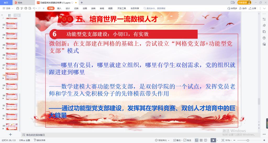 他指出,要深入學習貫徹黨的立德樹人教育理念,創新開展雙創學院支部黨建活動,在支部建在網格的基礎上,嘗試設立“網格黨支部+功能型黨支部”模式,把組建“全國大學生數學建模大賽功能型黨支部”作為黨建的引領示范點,目前該黨支部有師生黨員20名,入黨積極分子85名。通過功能型黨支部建設,做到“哪里有黨員,哪里就建立組織”;“哪里有學生的雙創教育和實訓教育需求,黨的組織就跟進建到哪里”。充分發揮黨員老師和學生及入黨積極分子的先鋒模范帶頭作用,發揮功能型黨支部在實驗實訓教學、學科競賽、創新創業人才培育中的巨大能量。