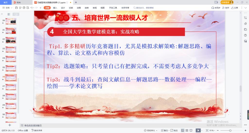 潘澤江從“弘揚偉大建黨精神”“凝聚奮進新時代的強大動力”“建好學科競賽功能型黨支部”“培育世界一流數模人才”等四個方面,為數學建模競賽功能型黨支部全體師生上了一堂生動的偉大建黨精神教育課。