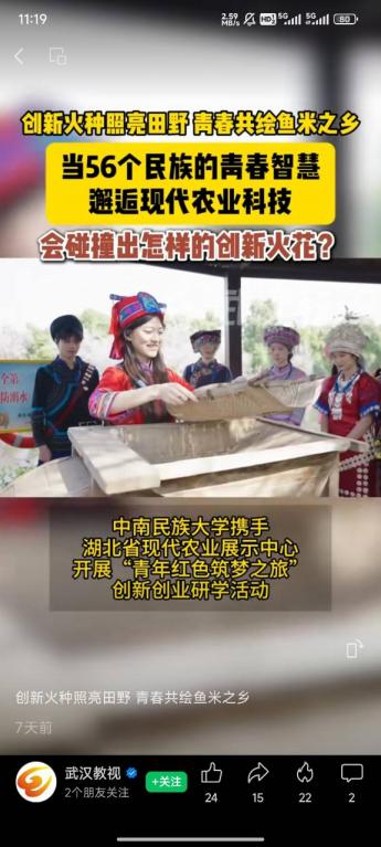 武漢教視:創新火種照亮田野 青春共繪魚米之鄉——中南民族大學攜手湖北省現代農業展示中心開展“青年紅色筑夢之旅”創新創業研學活動