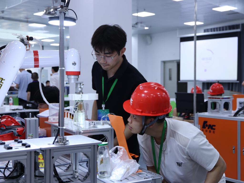 本次比賽設有賽前夾具創新設計、現場競賽、場外答辯三個環節。現場競賽包括視覺系統調試、數字孿生虛擬仿真調試、液體瓶罐分裝及數字孿生虛實聯調等項目,主要考察及評估選手對工業協作機器人、可編程控制器、機器視覺等設備的應用能力及解決復雜工程問題的能力。
