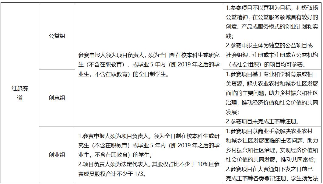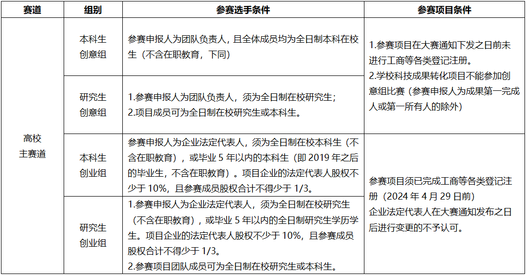 各教學單位、各創新創業團隊: 為貫徹落實黨的二十大精神,深入貫徹落實習近平總書記關于教育的重要論述和給“青年紅色筑夢之旅 ”大學生重要回信精神,“三位一體 ”統籌推進教育、科技、人才工作,把創新教育貫穿教育活動全過程,加強拔尖創新人才自主培養,培育新質生產力發展新動能,根據《教育部關于舉辦中國國際大學生創新大賽(2024)的通知 》(教高函〔2024〕9號)和《省教育廳關于舉辦中國國際大學生創新大賽(2024)湖北省復賽的通知》(鄂教高函〔2024〕14號)文件精神,學校決定舉辦中國國際大學生創新大賽(原“互聯網+”大賽)(2024)校級選拔賽(以下簡稱“大賽”)。現將有關事項通知如下: 一、大賽主題 我敢闖,我會創。 二、大賽內容 (一)參賽對象 1.參賽選手。中南民族大學全日制在讀和畢業5年以內(2019年以后的畢業生,不含在職教育)的本科生、碩士研究生和博士研究生,年齡不超過35歲(即1989年3月1日及以后出生) 2.參賽形式。參賽選手以項目團隊形式參賽,每隊成員(含項目負責人)不少于3人,不多于15人;每位參賽選手最多只能擔任一個項目負責人,但可以作為項目成員同時參加其他項目,項目負責人必須參加大賽的展示和答辯環節。參賽自報名起就需確定項目負責人、團隊成員和指導教師,且原則上只可進行人員刪減,不可進行人員順序調整及人員添加。 3.參賽平臺。各參賽團隊自參與大賽起(含院級賽)必須由項目負責人登錄“全國大學生創業服務網”(cy.ncss.cn)和中南民族大學創新創業教育管理信息化服務平臺完成網上報名,且兩個平臺上項目負責人、團隊成員和指導教師的信息及人員順序需一致。跨校組建團隊的,項目負責人須由我校學生或畢業生擔任。 (二)賽道安排 1.高教主賽道。高教主賽道參賽項目要能夠緊密結合經濟社會各領域現實需求,充分體現高校在新工科、新醫科、新農科、新文科、“人工智能+”建設方面取得的成果,培育新產品、新服務、新業態、新模式,促進制造業、農業、衛生、能源、環保、戰略性新興產業等產業轉型升級,促進數字技術與教育、醫療、交通、金融、消費生活、文化傳播等深度融合。參賽項目團隊應認真了解和把握新質生產力的內涵及要求,結合以上分類及項目實際,合理選擇參賽項目類別,根據 “四新”“人工智能+”建設內涵和產業發展方向選擇相應類型。 主賽道參賽項目報名時,根據參賽申報人所處學習階段,項目分為本科生組、研究生組。根據所處創業階段(以2024年4月29日前是否完成工商等各類登記注冊為準),本科生組和研究生組均內設創意組、創業組。 2.“青年紅色筑夢之旅”賽道(以下簡稱“紅旅賽道”)。紅旅賽道參賽項目應符合大賽參賽項目要求,在推進農業農村、城鄉社區經濟社會發展等方面有創新性、實效性和可持續性。 紅旅賽道參賽項目報名時,根據項目性質、特點和階段,分為公益組、創意組、創業組。 3.產業命題賽道。產業命題賽道旨在加強產學研深度融合,發揮開放創新效用,打通高校智力資源和企業發展需求,協同解決企業發展中所面臨的技術、管理等現實問題,引導高校將創新創業教育實踐與產業發展有機結合,促進學生了解產業發展狀況,培養學生解決產業發展問題的能力。產業命題賽道采取揭榜答題方式比賽,參賽團隊所提交的命題對策須符合所答企業命題要求,詳見大賽產業命題賽道方案。 校賽產業命題賽道與主賽道、紅旅賽道分開進行,以組委會通知為準。 (三)比賽方式 校賽設置院級初賽、校級復賽、校級決賽三級賽制。 院級初賽由各學院自主舉辦,比賽環節、評審方式由各學院自行決定。 校級復賽、決賽由創新創業學院組織。校級復賽采用網評方式進行評審;校級決賽采取項目現場公開路演答辯的方式進行。 (四)參賽選手和項目要求 根據教育部發布的大賽通知,各賽道、組別的參賽選手和項目條件如下:
