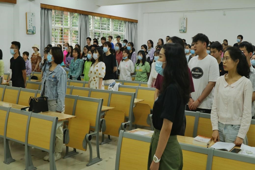 音樂微黨課上,張弘對《義勇軍進行曲》的創作背景、詞曲作家、社會影響進行了詳細介紹。《義勇軍進行曲》是由田漢作詞、聶耳作曲,在抗日救亡運動中譜寫的歌曲,田漢完成故事梗概和主體歌詞后被國民黨反動派逮捕入獄,隨后聶耳在躲避國民黨政府追捕的顛沛流離中完成了曲譜定稿。《義勇軍進行曲》高昂激越、鏗鏘有力的旋律和鼓舞人心的歌詞,表達了中國人民對帝國主義侵略的強烈憤恨和反抗精神,體現了中國共產黨人在侵略面前勇敢、堅強、團結一心共赴國難的英雄氣概。歌曲在全世界取得了巨大的反響,成為當時流行的革命戰歌并被許多國家翻譯、改編、傳唱。張弘通過曲譜展示和歌詞賞析為全體學員進行了具體的歌曲分析,她表示,《義勇軍進行曲》是中國共產黨人用熱血和忠誠譜寫的歌曲,中國共產黨人不斷用智慧和膽略續寫著中華民族從站起來、富起來到強起來的偉大飛躍。張弘強調,作為青年學生黨員應在歌曲中汲取精神力量,時刻牢記自己的黨員身份,把政治標準擺在首位,自覺遵守黨章要求,全心全意為廣大學生服務。隨后,張弘帶領全體學員共同起立歌唱國歌。