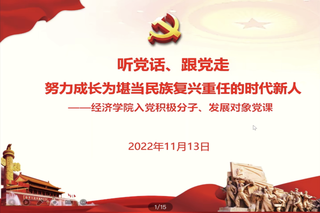 為深入學(xué)習(xí)宣傳貫徹黨的二十大精神,夯實學(xué)員理論基礎(chǔ),加強(qiáng)黨性修養(yǎng),11月12日至13日,經(jīng)濟(jì)學(xué)院于線上舉辦了2022下半年預(yù)備黨員、黨員發(fā)展對象和入黨積極分子培訓(xùn)班,全體學(xué)員參加學(xué)習(xí)。