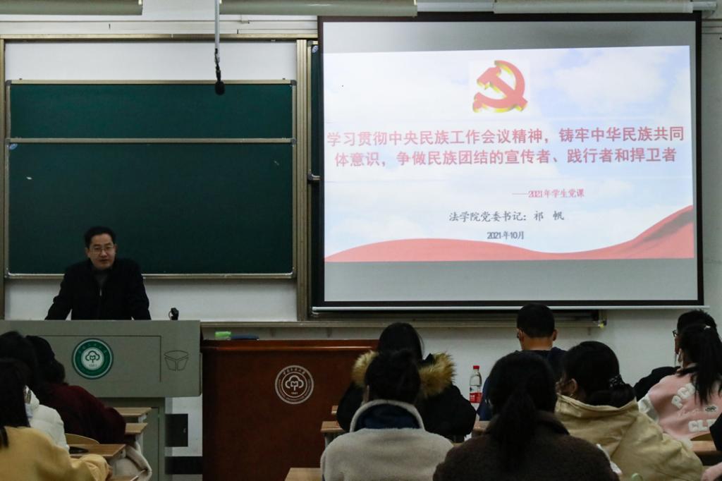 法學院黨委書記祁帆以《學習貫徹中央民族工作會議精神,鑄牢中華民族共同體意識,爭做民族團結的宣傳者、踐行者和捍衛者》為題,詳細介紹了改革開放以來中國特色社會主義民族政策的新發展,指出了新時代下黨的民族政策的完善與創新,全面分析了中央民族工作會議精神。他要求學員們堅定追隨黨的腳步,堅持將鑄牢中華民族共同體意識為民族工作的主線,強化社會主義核心價值觀的引領,旗幟鮮明地反對錯誤的民族主義思潮,樹立國家和中華民族共同體意識。