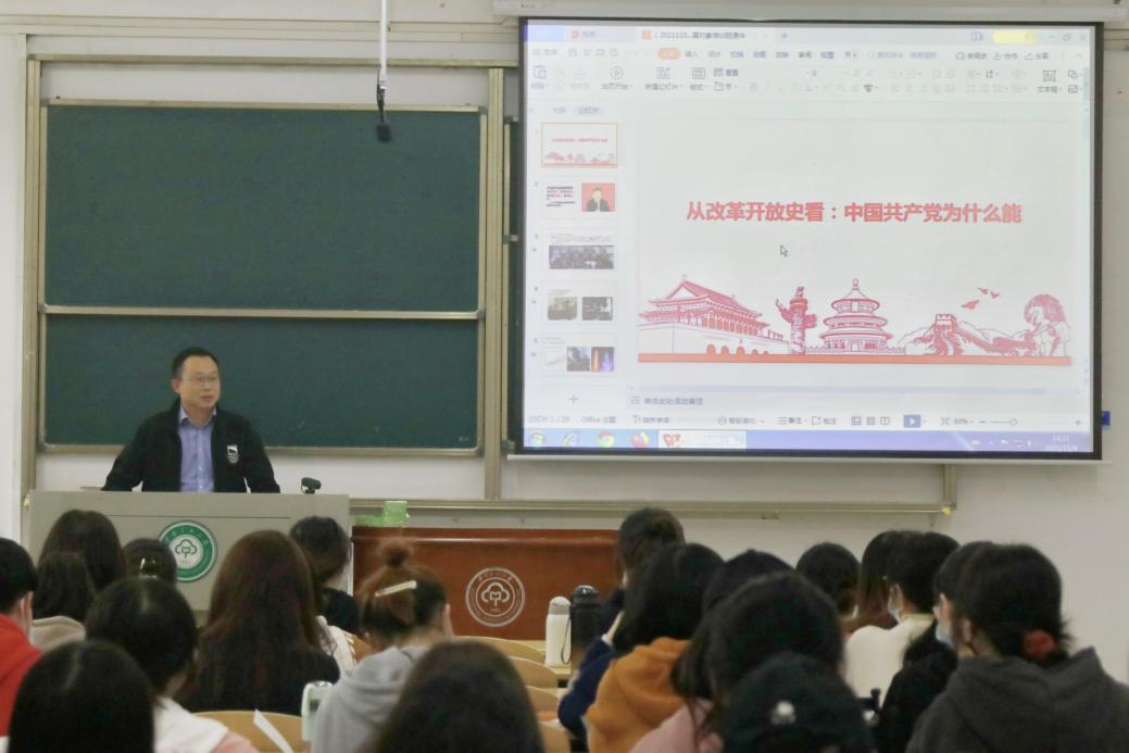 經濟學院黨委副書記劉君強以《從改革開放史看:中國共產黨為什么能》為題,從經濟狀況、社會領域、意識形態三個方面講述了改革開放以來共產黨如何克服社會主義建設中的重重困難與挑戰。他強調,黨取得偉大成就的關鍵在于堅持黨的為人民服務宗旨、堅持共產黨的堅強領導、堅持中國特色社會主義道路、堅持不斷發展科學理論、堅持群眾路線和堅持自我革命。學員們要在黨史學習中充分汲取養分,不斷充實自己的黨史知識,提高政治敏感性,在大是大非前做出有利于黨、國家和人民的選擇。