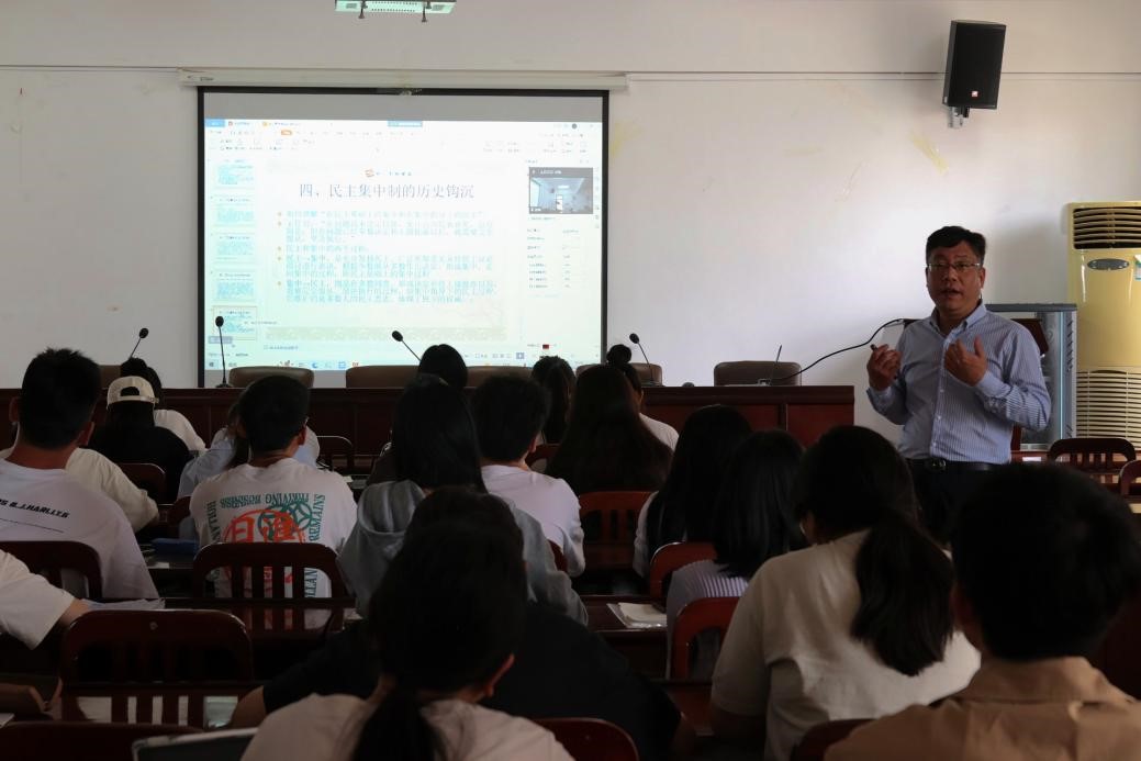 第二講由外語學院黨委書記戴迎峰主講。他以《黨史中的民主集中制,探索來時的路》為題,詳細講解民主集中制的具體內涵,圍繞“關于民主的幾個問題”“領導人關于民主集中制的論述”“什么是黨的民主集中制”“民主集中制的歷史鉤沉”四大主題強調民主集中制的重要性,與學員們討論如何做到合理民主,并鼓勵學員們堅定理想信念,堅決維護民主集中制,在深入學習黨史之中體會黨史的意義內涵。