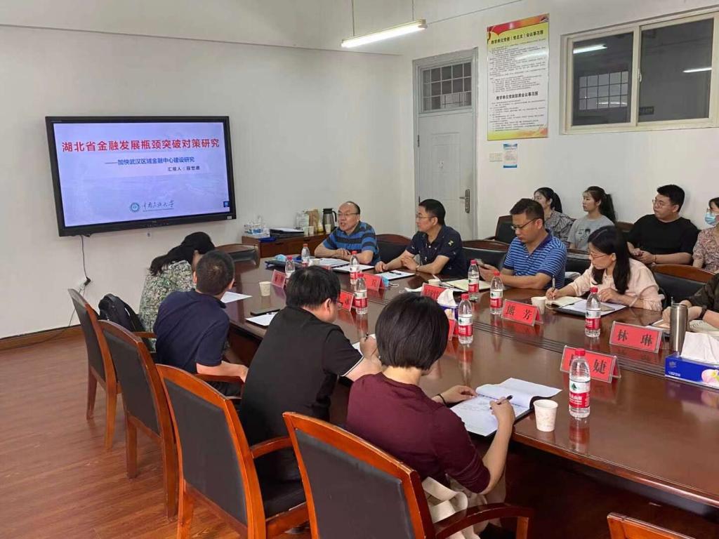 本站訊(記者:李國瑞毛福劉薇)破解湖北金融發(fā)展瓶頸,加快武漢區(qū)域融中心建設(shè),是湖北構(gòu)建新發(fā)展格局的重要內(nèi)容,也是我院段世德老師承擔(dān)的湖北省新型智庫研究項(xiàng)目的研究對象。為了提升課題的研究質(zhì)量,更好服務(wù)地方經(jīng)濟(jì)社會(huì)發(fā)展,5月29日上午,《湖北省實(shí)現(xiàn)金融瓶頸突破對策研究》開題報(bào)告會(huì)在151023舉行,中南民族大學(xué)科學(xué)研究發(fā)展院耿新副院長出席會(huì)議并承諾學(xué)校將做好管理和服務(wù)以確保課題高質(zhì)量完成。課題組主要成員、金融專碩2020級全體在讀研究生全程參與。開題報(bào)告會(huì)由經(jīng)濟(jì)學(xué)院副院長熊芳主持。