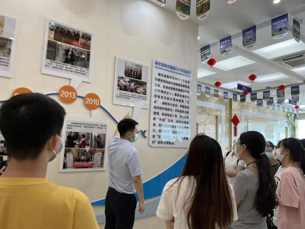 隨后,民大師生一行到崇陽農商行十字街支行進行參觀,詳細了解廳堂服務、日常業務、金融產品等情況。
