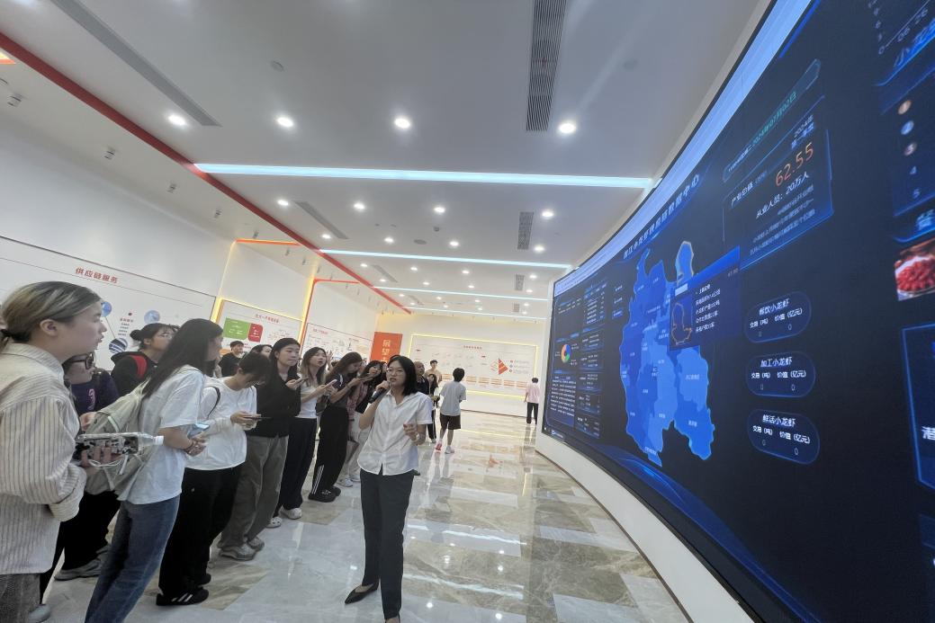 講解員重點(diǎn)介紹了“蝦稻共作”模式,強(qiáng)調(diào)了該模式的創(chuàng)新性與優(yōu)產(chǎn)性;講解了潛江小龍蝦的供應(yīng)鏈模式、供應(yīng)鏈體系、供應(yīng)鏈網(wǎng)絡(luò),同時(shí)以數(shù)字化的形式向師生們展示了其公共信息、會(huì)展貿(mào)易、勞務(wù)派遣等,展現(xiàn)了數(shù)字化與智能化給農(nóng)產(chǎn)品貿(mào)易切實(shí)帶來(lái)的便利與遞增的經(jīng)濟(jì)效益。