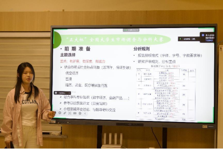 谷源圍繞“正大杯”全國大學生市場調查與分析大賽展開分享。她認為,競賽前期的主題選擇要“新”意十足、“深”入挖掘,要結合當下熱點與專業知識。在實證分析時,不能舍本逐末追求模型的華麗,而要注重實際應用,讓分析結果真正“落地”,從而提出切實可行的建議。