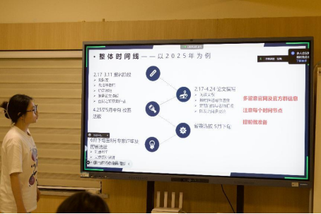 程欣睿則從競賽的宏觀視角出發。她表示,參與學科競賽是一場“學以致用,以賽促學”的修行。她以2025年競賽時間線為例,詳細拆解了報名、論文撰寫、各級選拔等關鍵節點的任務,提醒同學們把握時機,提前謀劃。