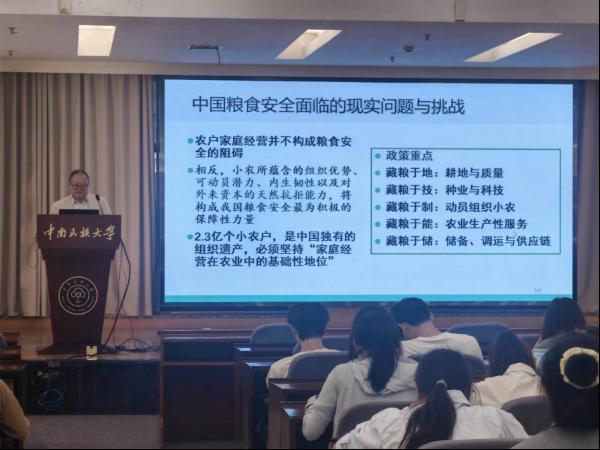 王雅鵬教授從什么是糧食安全及其被重視的起因?新時期中國的糧食安全戰略與成就、中國糧食安全面臨的現實問題與挑戰、中國糧食安全的政策建議及策略和中國糧食安全的熱點問題討論等五個方面進行了專題報告。關于什么是糧食安全及其被重視的起因?他從多視角對糧食安全的概念進行了闡述,并對糧食安全被重視的原因進行了追溯。關于新時期中國的糧食安全戰略與成就,他指出黨的十八大以來,以習近平同志為核心的黨中央高度重視國家糧食安全,始終把解決好十幾億人口的吃飯問題,作為治國理政的頭等大事,目前我國糧食安全整體趨勢向好;關于中國糧食安全面臨的現實問題與挑戰,他從耕地“非農化”、“非糧化”,政府抓糧、農民種糧積極性減弱,以及全球主要糧食價格供求形勢轉緊等方面進行了闡述;關于中國糧食安全的政策建議及策略,他指出在糧食安全問題上,必須要居安思危,增強憂患意識,要落實耕地責任保護制度,構建大食物觀統籌下的耕地保護協同治理體系,以提高糧食的國際競爭力;關于中國糧食安全的熱點問題討論,圍繞轉基因技術與糧食安全、低碳經濟與糧食安全這兩個熱點問題進行了分析,他認為轉基因技術及其品種在糧食生產中的應用將會成為歷史的必然,要積極推行“糧食生產低碳化”,推進低碳經濟與糧食安全協調發展。