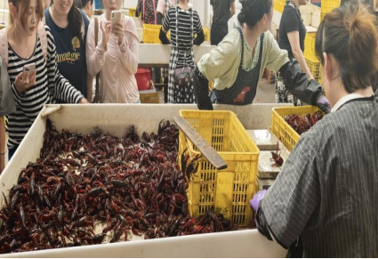 潛江小龍蝦交易中心有“中國(guó)蝦谷”之稱,是全球最大的小龍蝦集散中心,這里有供應(yīng)鏈平臺(tái),提供撮合交易、倉(cāng)儲(chǔ)物流、金融貸款等服務(wù)。在交易市場(chǎng)車間,師生目睹分揀、置冰、打包、發(fā)貨快速流程,操作人員在3秒內(nèi)精準(zhǔn)識(shí)別小龍蝦的大小、色澤與鮮活度,日均處理量超300噸。