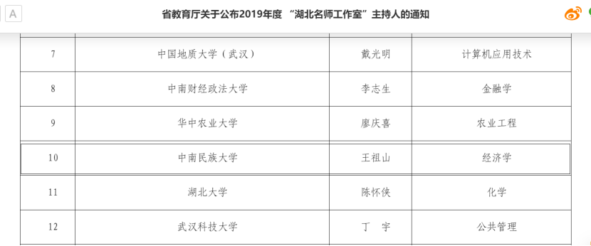 本站訊(記者:王娜)近日,湖北省委組織部、省教育廳公布了2019年度“湖北名師工作室”主持人人員名單,經各地教育部門、各高校遴選推薦,專家評審,社會公示,經濟學院王祖山教授成功入選,并獲“湖北名師工作室”主持人“湖北名師”稱號。