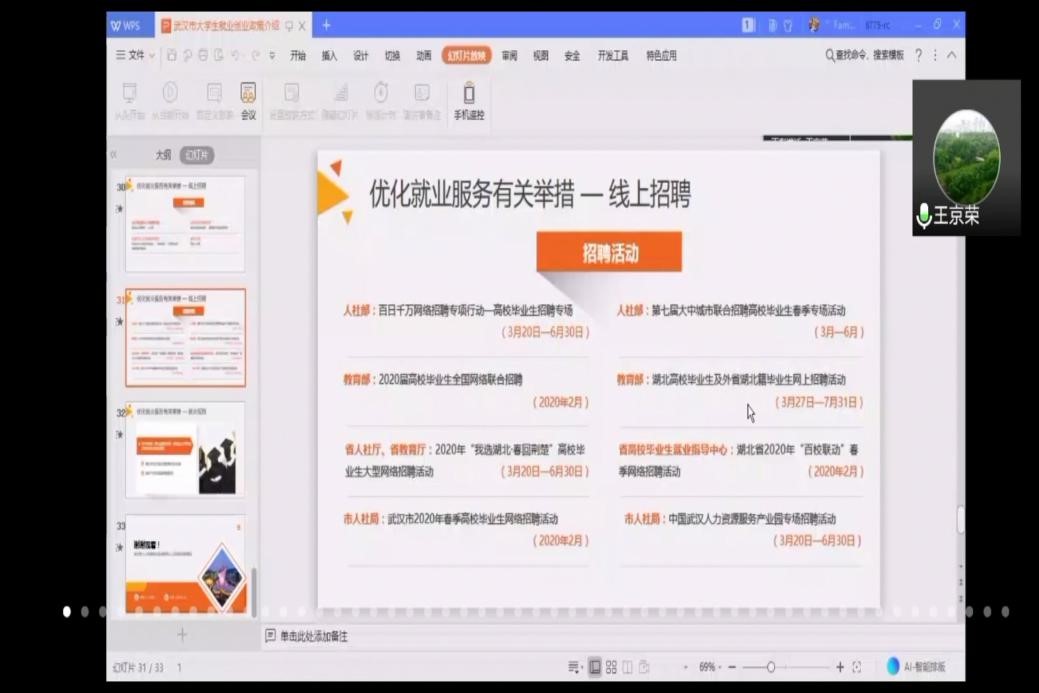 王京榮圍繞當前就業(yè)形勢、穩(wěn)定和促進就業(yè)工作舉措、畢業(yè)生就業(yè)建議等方面展開講授。他指出,由于疫情影響,畢業(yè)生就業(yè)出現(xiàn)了求職時間擠壓、招聘活動受限、崗位供給減少等問題。圍繞當前的就業(yè)政策,王京榮指出,為應(yīng)對當前嚴峻的就業(yè)形勢,根據(jù)中央部委文件、湖北省就業(yè)工作文件、武漢市就業(yè)工作等相關(guān)要求,湖北省人社部出臺了一系列相關(guān)大力拓寬高校畢業(yè)生就業(yè)的工作舉措,比如擴大企業(yè)吸納規(guī)模,擴大基層就業(yè)規(guī)模,擴大招生入伍規(guī)模,擴大就業(yè)見習規(guī)模,適當延遲錄用接收,加大對湖北等疫情嚴重地區(qū)就業(yè)支持等,不斷穩(wěn)定和促進畢業(yè)生就業(yè)工作。王京榮建議同學(xué)們,要重視線上線下招聘活動,瀏覽各級公共招聘網(wǎng)、人才網(wǎng)、前程無憂等機構(gòu)網(wǎng)站,并切實關(guān)注人社部、教育部等部門的相關(guān)招聘活動時間,及時獲取相關(guān)招聘信息,保證更好就業(yè)。