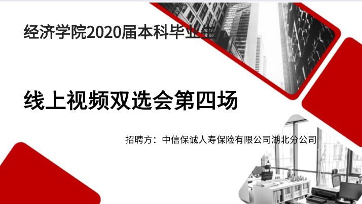 本站訊(記者:郝振興)為持續推進畢業生就業工作,進一步拓寬就業渠道,5月8日上午,經濟學院通過騰訊會議舉辦2020屆本科畢業生第四場線上雙選會。此次會議由中信保誠人壽保險有限公司湖北省分公司業務經理陳薇、鄭東主講,風險管理與保險學系主任鮑金紅教授、畢業班輔導員徐瑩、杜光耀以及經濟學院2016級本科畢業生參加會議,學院黨委副書記李忠賢主持會議。