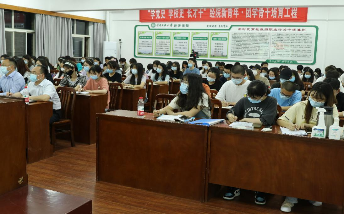 本站訊(記者:劉筱雨)5月7日晚,校長李金林參加經濟學院經濟學大類2009班“學黨史 學校史 長才干”主題團會,為學生講校史,勉勵學生知校、愛校、榮校。經濟學院2009班全體學生、學院黨委副書記、院長李波、黨委副書記劉君強、2019和2020級輔導員及學院團學骨干培育工程學員到場學習。