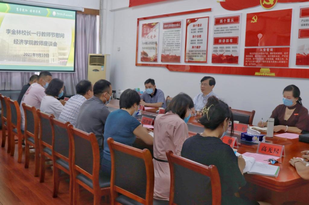 本站訊(記者:唐慧揚)9月10日下午,校黨委副書記、校長李金林,審計處處長關虹,離退休工作處黨委書記金軍到經濟學院看望慰問教職工并召開教師座談會。經濟學院院領導李波、劉君強、吳嬰、毛中明陪同并參加會議。座談會由經濟學院黨委副書記、院長李波主持。