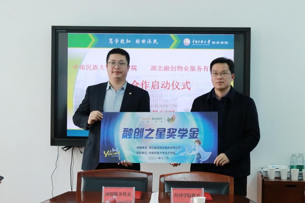 為鼓勵(lì)經(jīng)院學(xué)子勤奮學(xué)習(xí),助力學(xué)生學(xué)有所成,融創(chuàng)物業(yè)服務(wù)有限公司在學(xué)院設(shè)立“融創(chuàng)之星獎(jiǎng)學(xué)金”,市場(chǎng)部總監(jiān)李田驥和學(xué)院黨委書(shū)記柯尊韜共同進(jìn)行了獎(jiǎng)學(xué)金的揭牌儀式。