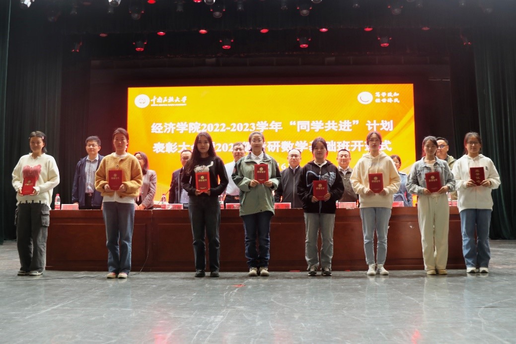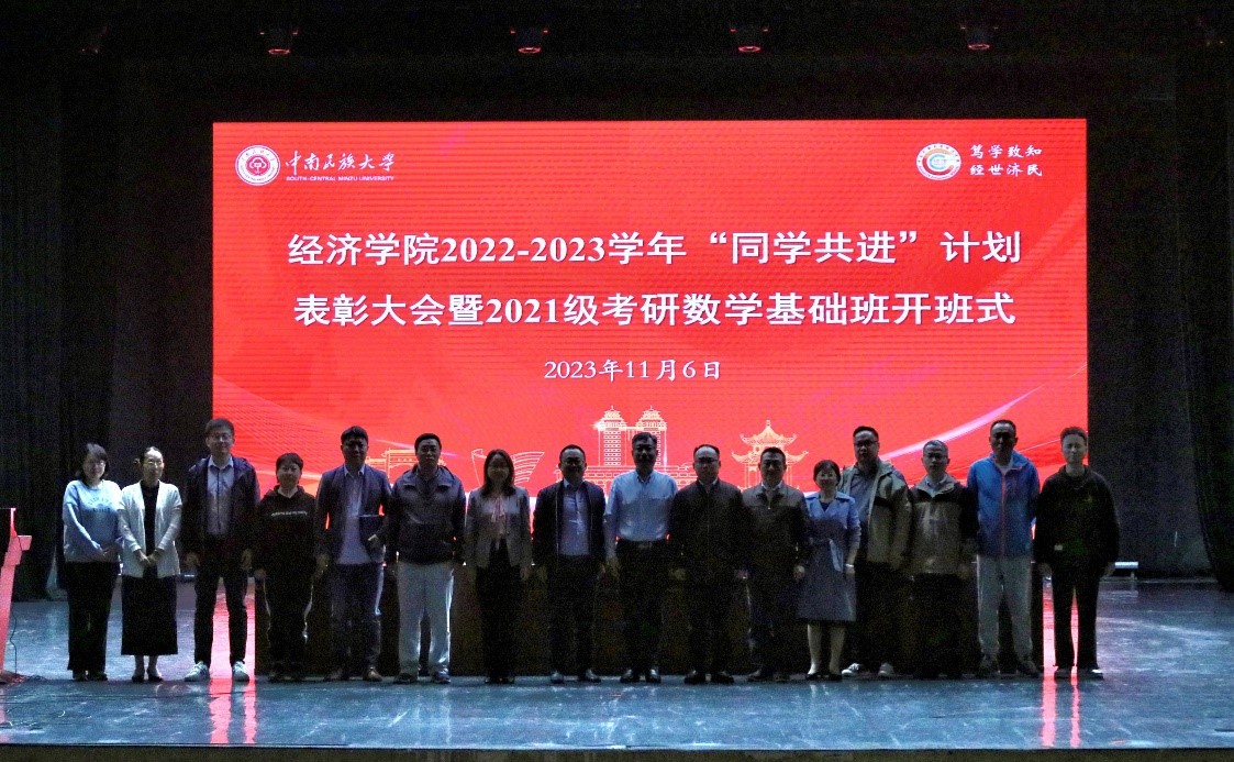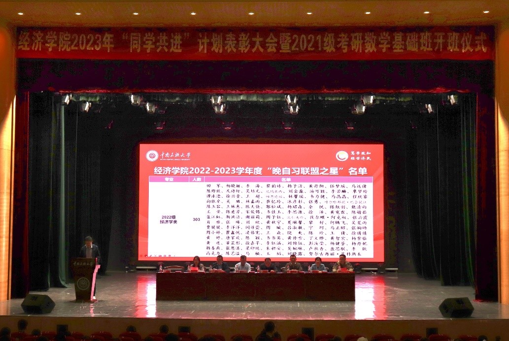為深入開展鑄牢中華民族共同體實踐教育,持續營造并鞏固互助共學的良好學風院風,2023年11月6日晚上,經濟學院在大禮堂召開2022-2023學年“同學共進”計劃表彰大會暨2021級考研數學基礎班開班儀式,全體院領導、教研室主任、輔導員、班導師代表、受表彰學生代表、2021級參加考研數學基礎班的學生、2023級全體學生參加了開班式,武漢高頓考研學校校長樊子洋等人應邀出席表彰大會,會議由經濟學院黨委副書記劉君強主持。