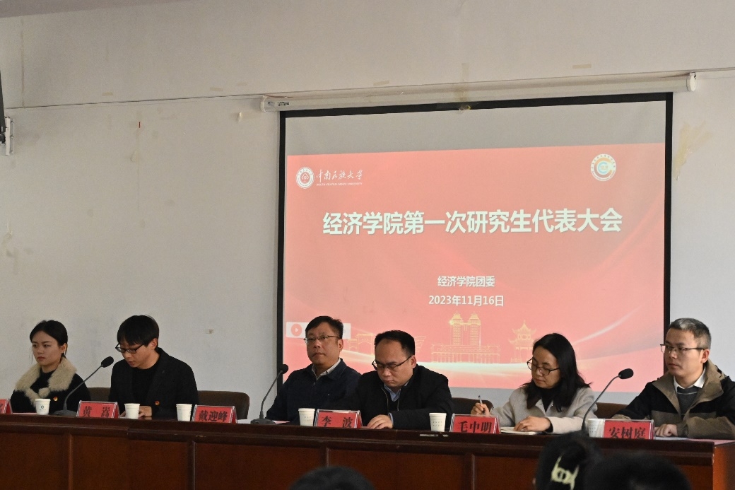 為進一步完善和加強研究生團學組織建設,11月16日下午,經濟學院在15號教學樓1006會議室隆重召開第一次研究生代表大會。經濟學院黨委書記戴迎峰,經濟學院院長李波、校團委副書記黃嵩、經濟學院副院長毛中明、經濟學院團委書記安樹庭、校研究生會主席團成員潘麒名及各年級研究生代表參加會議。會議由安樹庭主持。