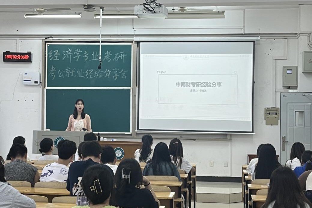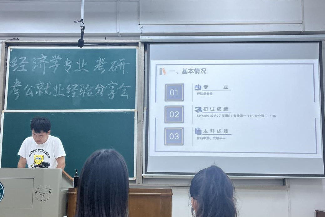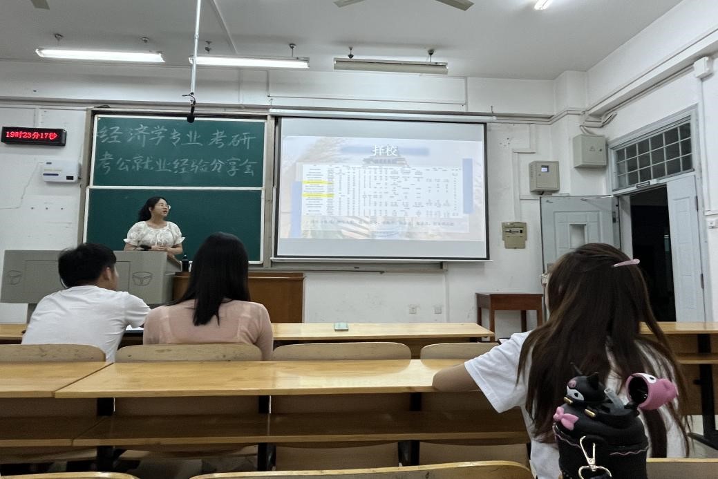 為幫助同學們了解考研、考公和求職的相關信息及備考技巧,解決同學們在未來職業(yè)規(guī)劃和學業(yè)發(fā)展方面的困惑,5月23日晚,經(jīng)濟學教研室邀請曾曦芝、陳小莉、龔穎琳、馬志威和楊欣雨五位優(yōu)秀畢業(yè)生為經(jīng)濟學專業(yè)2021級同學進行考研、考公、求職經(jīng)驗分享。經(jīng)濟學教研室主任馬宏、副主任閔銳和胡衛(wèi)東三位老師參加分享會。