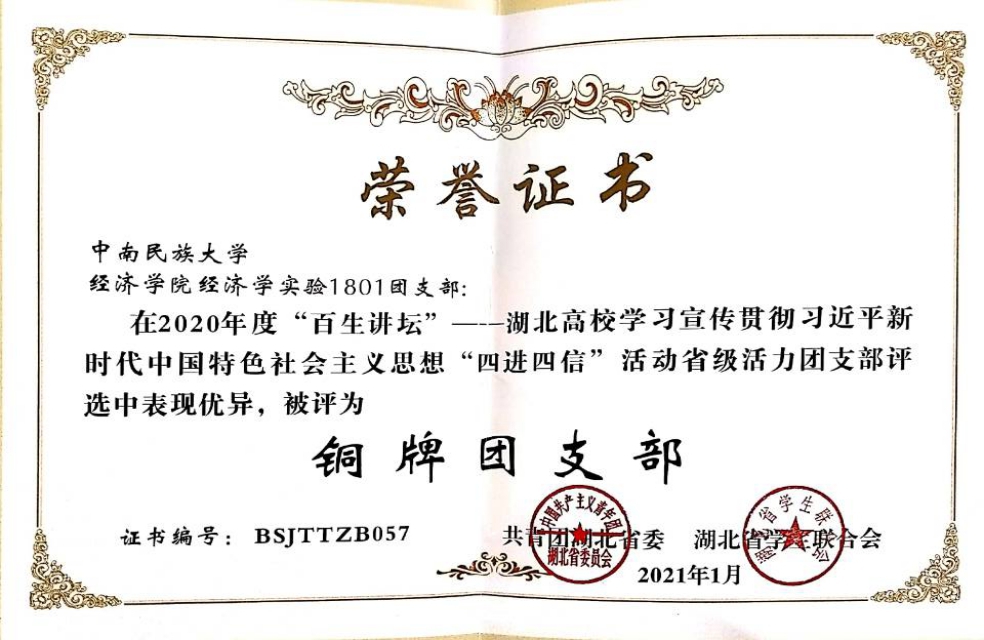 本站訊(記者:黃軒軒 唐慧揚)在共青團湖北省委、湖北省學生聯合會開展的“百生講壇”——學習宣傳習近平新時代中國特色社會主義思想“四進四信”活動中,我院經濟學實驗1801團支部奮勇爭先,取得優異成績,獲評省級“銅牌團支部”,是我校唯一一個獲得省級榮譽的團支部。