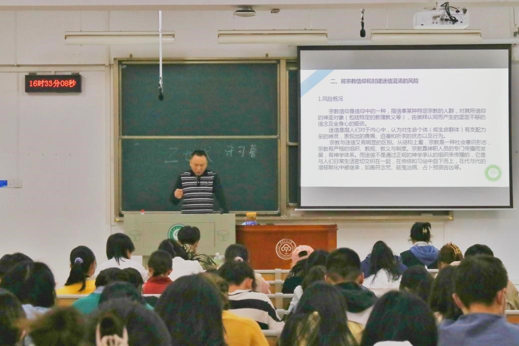 經濟學院2019級輔導員熊岳煒對大學生活中的五大風險——思想風險、學業風險、工作風險、生活風險及情感風險做出深入闡述,并結合實例一一進行分析,要求學員們積極參加思想政治教育和黨史學習教育,反對資產階級自由化思潮;正確區分宗教信仰與封建迷信,學習科學文化知識的同時,尊重他人的民族習俗;保持勤儉節約的生活習慣與優良的精神品質,防范享樂、奢靡的思想風險;在“內卷”的大環境中保持理性,拒絕“躺平”,不懈奮斗;警惕不法分子煽動民族矛盾,區分個人矛盾和民族矛盾,為民族團結與交流作出貢獻;積極參與社會實踐活動,培養社會責任感,擺脫網絡依賴。他希望學員們防范規避風險,培養良好的學習生活習慣,協調好學習與學生工作的關系,提高自身能力,實現自我成長。
