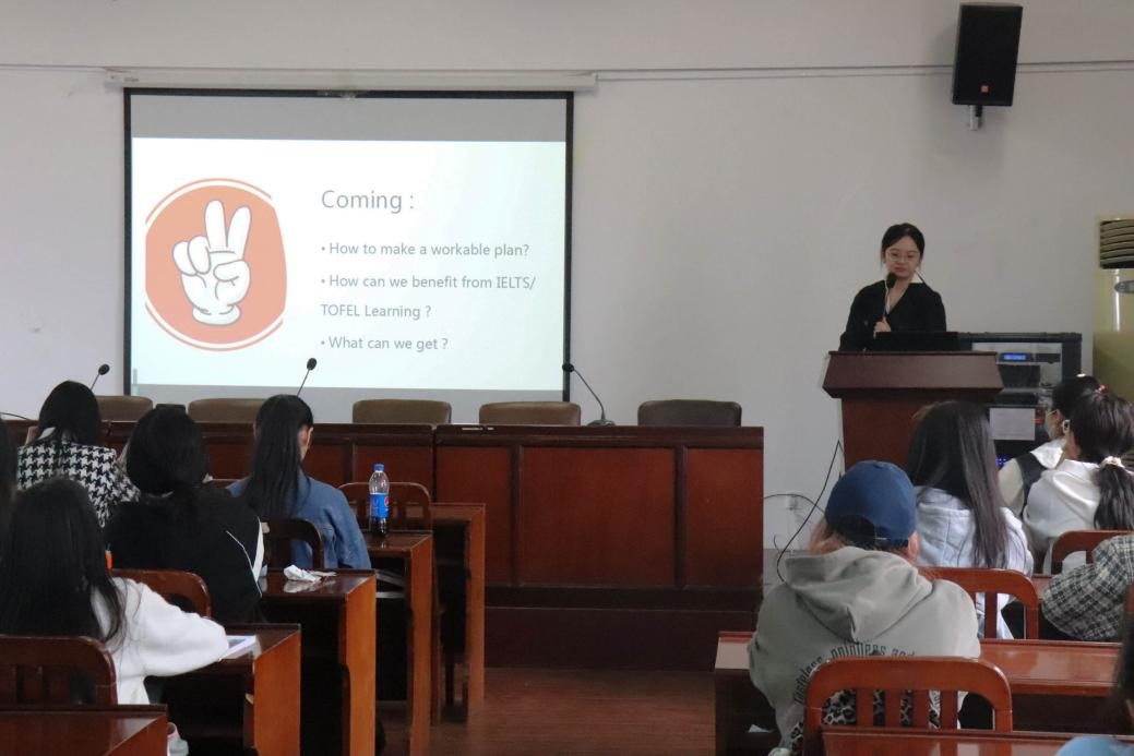 講座上,靖玉婷老師圍繞雅思、托福考試知識和如何在短時間內(nèi)提高英語水平兩個方面展開講解,建議同學們明確備考目標、認識到常規(guī)應試技巧的局限性、全面培養(yǎng)發(fā)散性思維、提高英語學習效率。劉宏毅老師從學習成績的重要性、國外院校錄取要求、留學申請時間規(guī)劃、申請材料準備等方面進行介紹,闡述了出國交流學習的基本程序,引導同學們以積極向上的心態(tài)面對留學過程中遇到的挑戰(zhàn),培養(yǎng)溝通能力和團隊協(xié)作能力,提升個人核心競爭力。