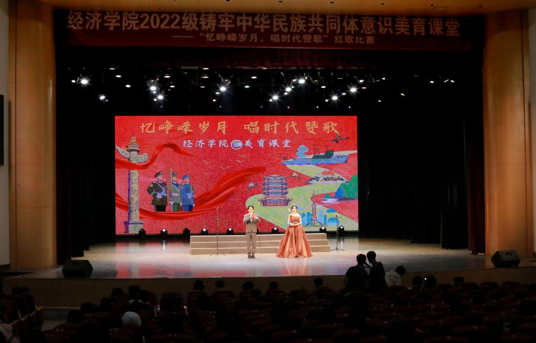 為引導(dǎo)廣大青年聽(tīng)黨話、跟黨走,弘揚(yáng)愛(ài)國(guó)主義精神,豐富校園文化生活,5月19日晚,經(jīng)濟(jì)學(xué)院在大禮堂舉辦鑄牢中華民族共同體意識(shí)美育課堂之“憶崢嶸歲月,唱時(shí)代贊歌”紅歌比賽。經(jīng)濟(jì)學(xué)院黨委書(shū)記柯尊韜,黨委副書(shū)記劉君強(qiáng),2022級(jí)部分班導(dǎo)師、2019級(jí)輔導(dǎo)員高無(wú)盡,2022級(jí)輔導(dǎo)員張弘、魯?,F(xiàn)場(chǎng)觀看紅歌比賽,2022級(jí)14個(gè)班級(jí)的全體學(xué)生參加比賽。