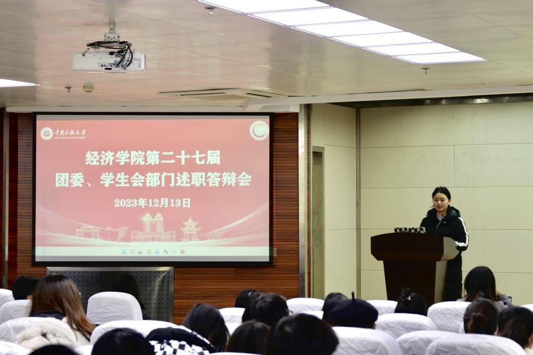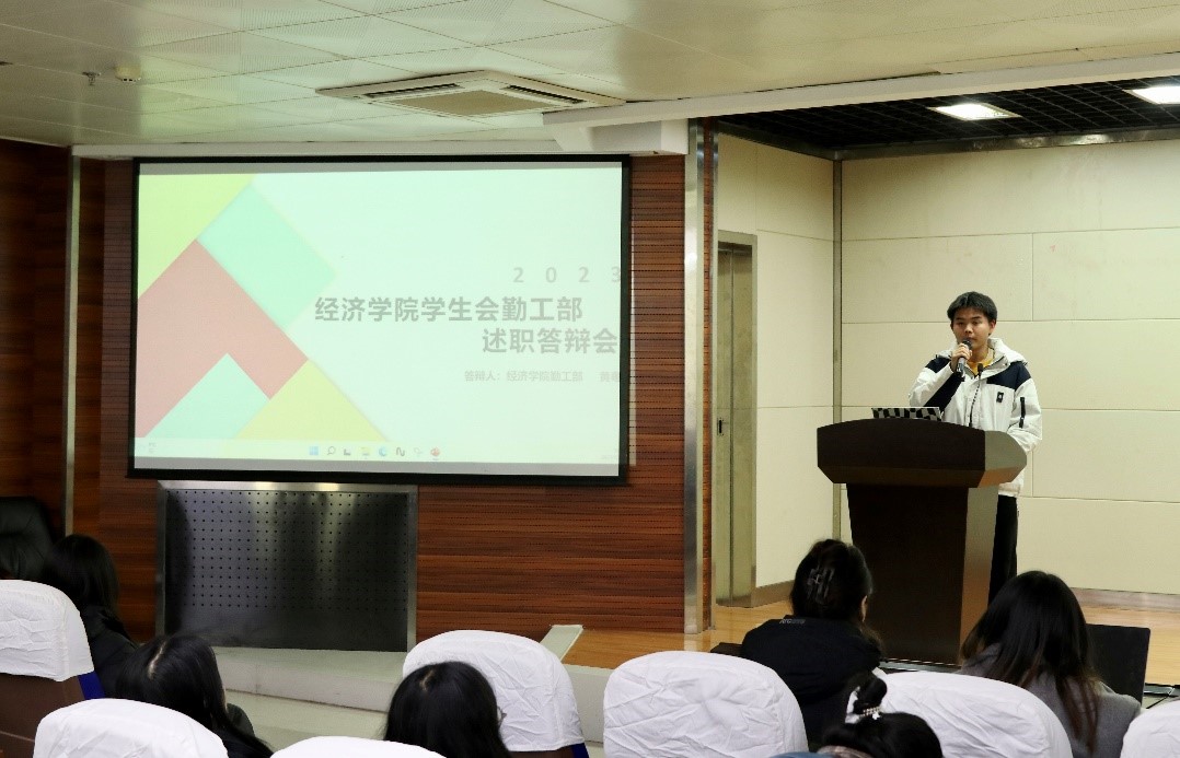 為加強階段性工作總結,展示各部門工作成果,促進經濟學院團委、學生會各部門更高效地開展工作,12月14日晚,經濟學院于16號教學樓2樓報告廳舉行第二十七屆團委、學生會部門述職答辯會。院團委書記安樹庭,院研究生會主席團成員、本科生團委副書記、學生會主席團成員擔任答辯評委。