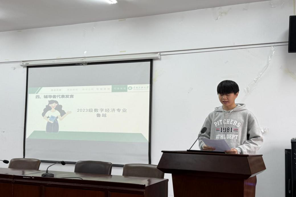 志愿者代表2023級數字經濟專業魯越同學上臺發言。他分享了自己參與學業幫扶活動的經歷和感受,表示通過輔導他人,自己對課程的理解更加深入,同時也收獲了滿滿的成就感。他鼓勵更多的志愿者積極參與到這項活動中來,共同為學院的學風建設貢獻力量。