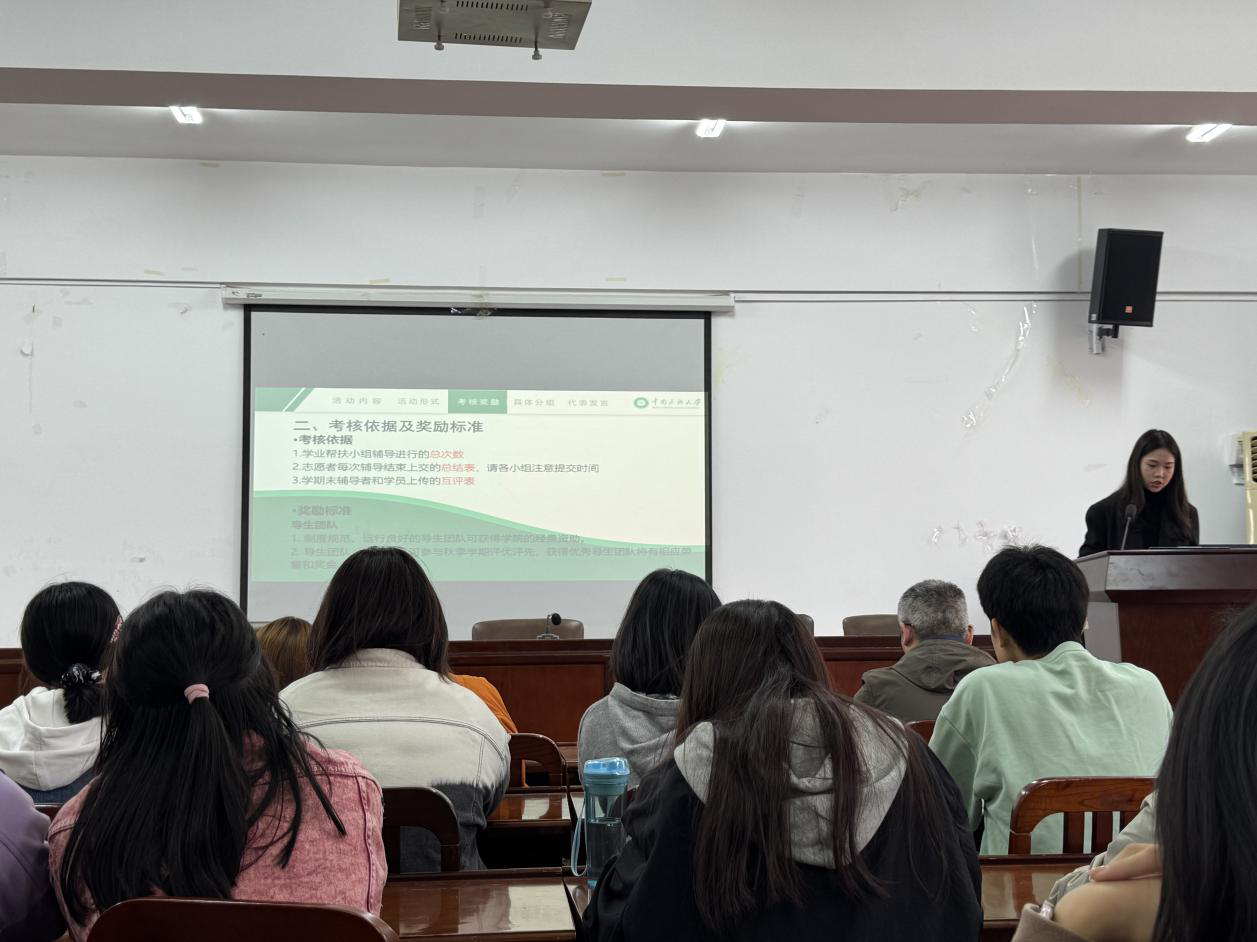 隨后,團委志工部副部長龍欣怡詳細闡述了學業幫扶活動的考核獎勵方案及分組情況。她強調,活動將依據輔導次數、總結表提交情況、學期末互評表等多維度進行考核,表現優秀的導生團隊和個人志愿者將獲得經費資助、評優評先、綜測加分等豐厚獎勵,同時公布了各學科的分組名單,確保了每位學員都能順利找到自己的輔導者。
