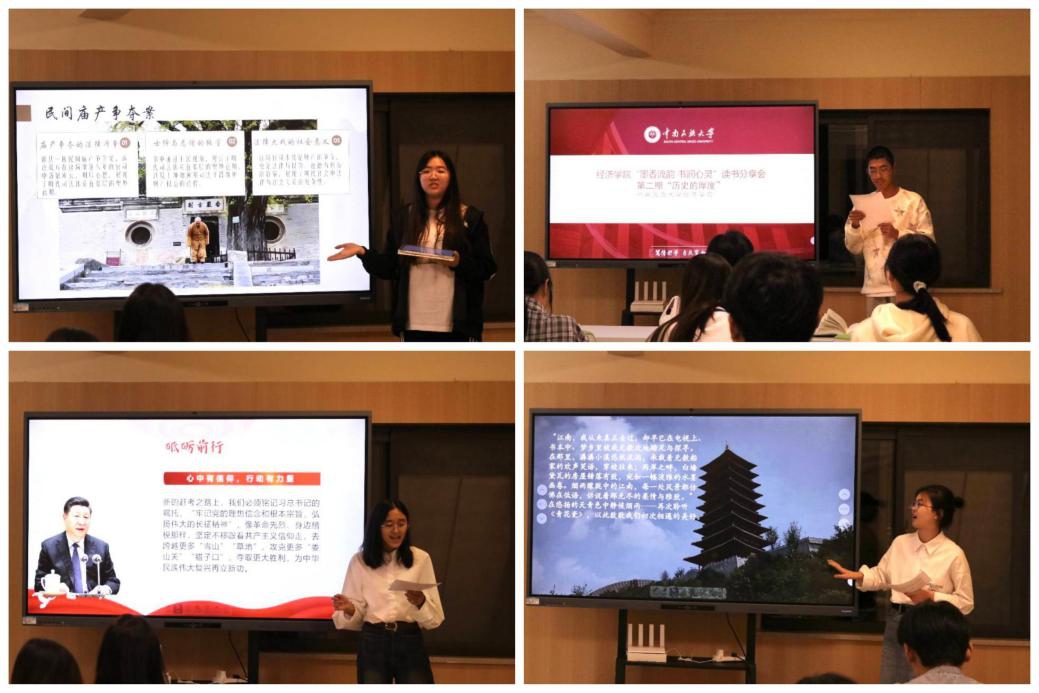 經(jīng)濟(jì)學(xué)試點(diǎn)班2201班譚艾佳以《顯微鏡下的大明》作為分享對(duì)象,運(yùn)用書(shū)中的四個(gè)小故事為切入點(diǎn),深刻剖析明朝社會(huì)小人物與大歷史背景之間的微妙聯(lián)系,生動(dòng)展現(xiàn)那個(gè)時(shí)代獨(dú)有的歷史文化風(fēng)貌。經(jīng)濟(jì)學(xué)試點(diǎn)班2201班劉金淼懷著對(duì)革命先輩的無(wú)限敬仰,深情講述《跟著信仰走——我們家的長(zhǎng)征故事》,書(shū)中家族成員參與長(zhǎng)征的親身經(jīng)歷所包含的勇氣、堅(jiān)持與犧牲精神,震撼著在場(chǎng)的每一個(gè)人,革命精神在新時(shí)代持續(xù)發(fā)光發(fā)熱。金融2303班解雨欣和數(shù)字經(jīng)濟(jì)2401班王恩妮分享的都是《明朝那些事兒》,解雨欣以明太祖朱元璋的傳奇人生作為分享重點(diǎn),以生動(dòng)的語(yǔ)言描繪這位布衣天子從草莽到帝王的艱辛歷程,直觀深刻地展示了明朝的開(kāi)國(guó)歷史,王恩妮注重于書(shū)中人物的故事和自身的感悟,分享了自己對(duì)于成功與失敗、堅(jiān)持與放棄的理解。金融2302班梁田從文學(xué)鑒賞的角度出發(fā),深入剖析《遺跡里的中國(guó)》,細(xì)致入微地分析了該書(shū)不同章回的寫(xiě)作手法,從敘述結(jié)構(gòu)到語(yǔ)言風(fēng)格,盡顯作者深厚的文字功底與對(duì)中華文明的深厚情感。數(shù)字經(jīng)濟(jì)2303班劉崔媛帶大家走進(jìn)《文化苦旅》的世界,她不僅介紹了書(shū)中歷史背景與文化內(nèi)涵,還現(xiàn)場(chǎng)朗讀了一段讀書(shū)后深受觸動(dòng)時(shí)寫(xiě)下的讀后感。