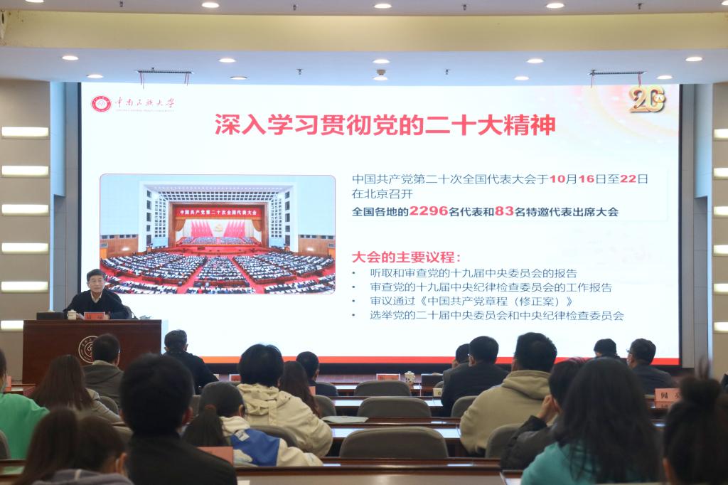 在觀看了黨的二十大精神宣講視頻后,邊境作《深入學習貫徹黨的二十大精神,爭做新時代的好青年》主題宣講。他從深刻領會黨的二十大主題,深刻領會過去5年的工作和新時代10年的偉大變革,深刻領會開辟馬克思主義中國化時代化新境界,深刻領會中國式現代化的中國特色和本質要求,深刻領會全面建設社會主義現代化國家的目標任務,深刻領會教育科技人才、法治建設、國家安全等方面的重大部署,深刻領會堅持黨的全面領導和全面從嚴治黨的重大部署,深刻領會應對風險挑戰(zhàn)的重要要求等8個方面向同學們宣講了黨的二十大精神。他指出,習近平總書記要求全黨把青年工作作為戰(zhàn)略性工作來抓,充分體現了以習近平同志為核心的黨中央對青年工作的重視,2020級本科生要懷抱夢想又腳踏實地,敢想敢為又善作善成,立志做有理想、敢擔當、能吃苦、肯奮斗的新時代好青年,為實現中華民族偉大復興的中國夢作出應有的貢獻。