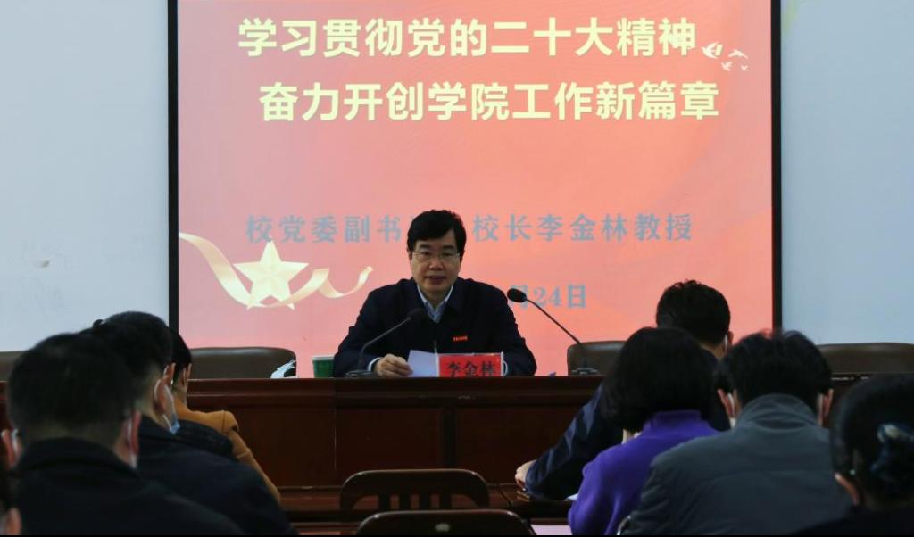 11月24日,校黨委副書記、校長李金林到經濟學院和資環學院宣講黨的二十大精神。兩個學院的領導班子成員、師生黨支部書記、本科生和研究生輔導員、辦公室干部和學生代表參加宣講會。會議由經濟學院黨委書記柯尊韜主持。
