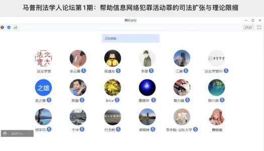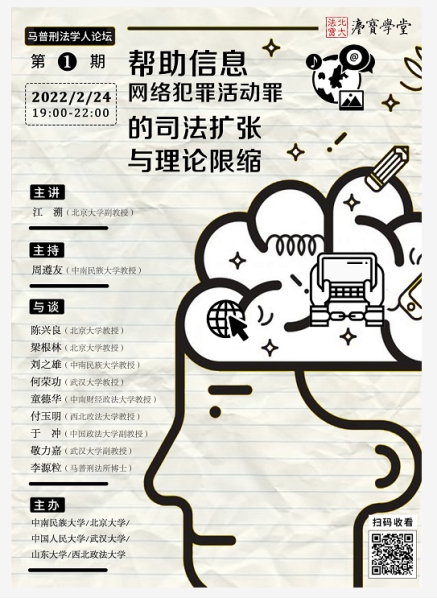 2022年2月24日19至22時,由中南民族大學、北京大學、中國人民大學、武漢大學、山東大學和西北政法大學等六校法學院學者共同發起的“馬普刑法學人論壇”第一期講座采用線上直播的方式舉辦。北京大學法學院副教授、博士生導師江溯老師應邀作了題為“幫助信息網絡犯罪活動罪的司法擴張與理論限縮”的學術講座。首期論壇由中南民族大學法學院主辦,我院周遵友教授擔任主持人。