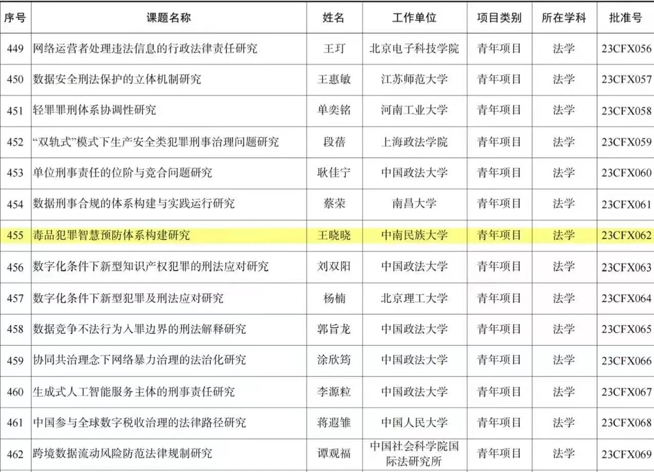 9月22日,全國哲學社會科學工作辦公室公布了2023年國家社科基金年度項目和青年項目立項名單。我院彭建軍教授申報的課題《中華民族共同體建設與相關法律規范調整完善研究》獲國家社科基金一般項目立項、王曉曉博士申報的課題《毒品犯罪智慧預防體系構建研究》獲批國家社科基金青年項目立項。