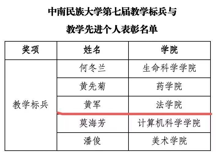 在第40個(gè)教師節(jié)來(lái)臨之際,經(jīng)學(xué)院推薦、學(xué)校教學(xué)工作委員會(huì)評(píng)議、教學(xué)獎(jiǎng)勵(lì)工作小組審議等程序,我校公布“中南民族大學(xué)第七屆教學(xué)標(biāo)兵與教學(xué)先進(jìn)個(gè)人”表彰名單。本次共評(píng)選出教學(xué)標(biāo)兵5名、教學(xué)先進(jìn)個(gè)人9名,法學(xué)院黃軍副教授榮獲“教學(xué)標(biāo)兵”稱(chēng)號(hào)。