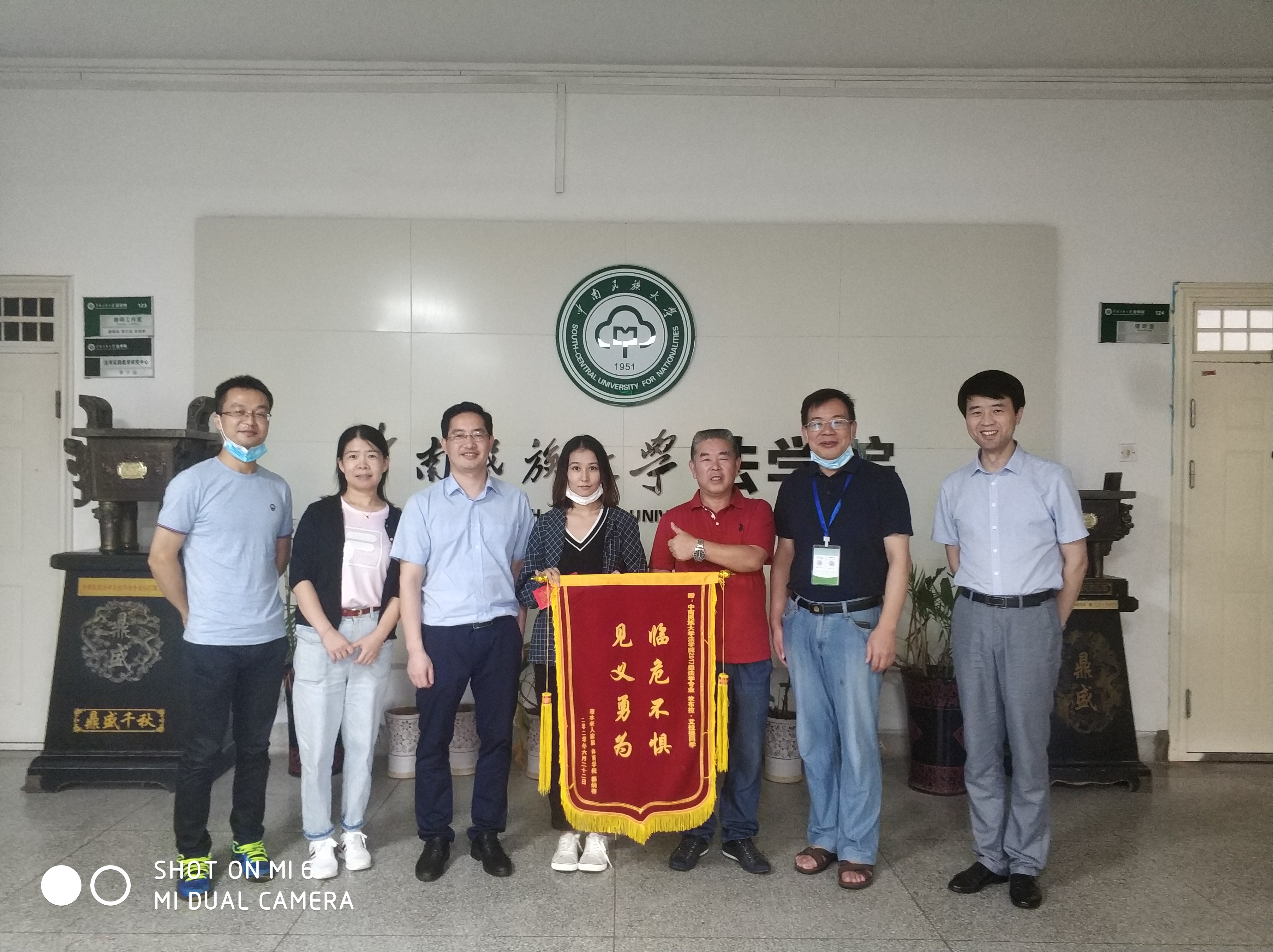 2020年6月22日上午11時(shí)許,我校體育學(xué)院郭炳德老師攜帶一面“臨危不懼,見(jiàn)義勇為”的錦旗來(lái)到法學(xué)院,在學(xué)院領(lǐng)導(dǎo)和老師們的見(jiàn)證下,親手將這面錦旗送到了坎布拉·艾海提同學(xué)的手中。