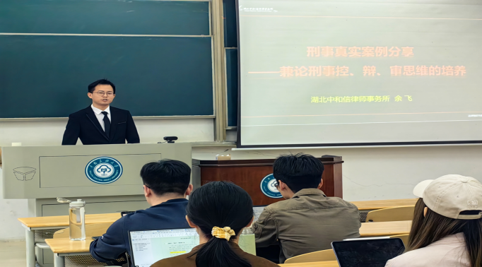 2025年4月22日下午,武漢市武昌區周冶陶公益服務中心(“調解網”)研究生實習實踐教育基地實務專家、湖北中和信律師事務所合伙人余飛律師應邀來到我院,為2024級法律碩士講授以“刑事真實案例分享——兼論刑事控、辯、審思維的培養”為主題的法律實務專題課程,趙波老師主持參與了此次專題授課。