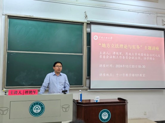 2024年11月1日法學院邀請武漢市人民代表大會常務委員會法制工作委員會汪向群副主任、恩施土家族苗族自治州人民代表大會常務委員會法制工作委員會譚艷軍副主任兩位實務專家走進校園,開展地方立法實務系列講座。