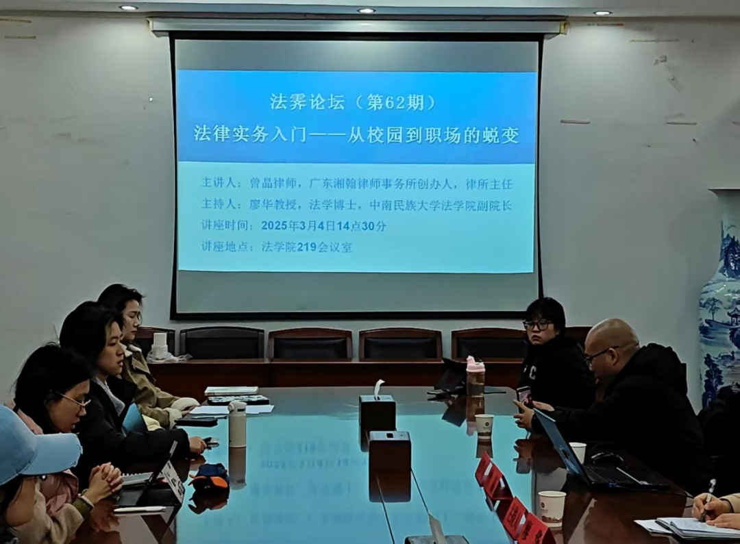 2025年3月4日下午,“法霽講壇”第62期講座于法學院219會議室開講。廣東湘翰律師事務所創辦人、律所主任,我院02級校友曾晶律師受邀做以“法律實務入門——從校園到職場的蛻變”為主題的講座。講座由廖華副院長主持,鄭武平老師、黎宇霞老師出席了本次講座,我院2021級本科生及研究生參加了本次講座。