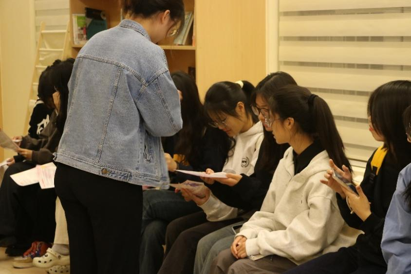 同學們于空中書屋中就座,交流分享對于本次參觀活動的感受與收獲并提出了一些改善建議。一些同學認為可以在空中書屋播放輕緩的音樂并設置清新香氛,以增加書屋的藝術氣息;還有同學希望可以增設線上咨詢服務,讓心理咨詢更加生活化和便利化。交談過后,值班助管同學為大家分發紀念書簽和心理咨詢宣傳單頁,使大家能夠更充分地了解并宣傳心理咨詢中心。