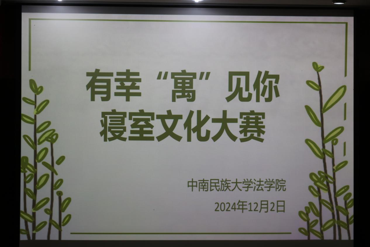 12月2日18點30分,法學院與美術學院攜手舉辦的有幸“寓”見你寢室文化大賽決賽在法學院模擬法庭正式拉開帷幕。本次大賽旨在展示各寢室的獨特文化,增進同學們之間的友誼,共同營造溫馨和諧的寢室氛圍,由法學院24級班導師顧德瑞老師、王曉曉老師、余濤老師、趙波老師,兼職輔導員黃子殷老師,研究生學長王玉濤,學生會主席武蘇豫學姐擔任評委,黃茜航主持。