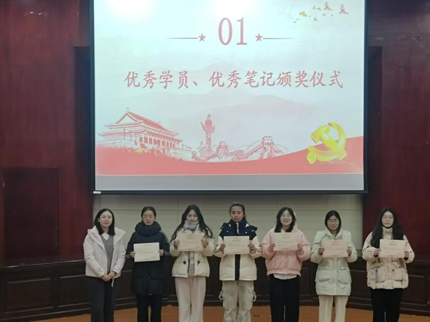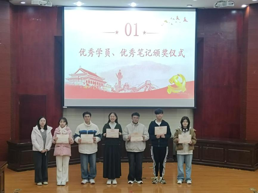 典禮伊始,張澤睿同學公布本期基層團校優秀學員名單。經過四節理論課的學習,各位學員的筆記寫滿了干貨和心得。團委優中選優,共選出了六本優秀筆記,分別是:一班鄒陽、二班楊惠軒、二班周錢月、四班敖應玲、五班利思嫻、六班黃茜航。同時,團委根據班級內民主投票選舉,并綜合考量其結業考試成績、課程表現、考勤等情況,從各團建班級中選拔出六名優秀學員,分別是:一班李晨曦、二班李超然、三班肖小月、四班覃國睿、五班楊昕燁、六班李柏橙。團委副書記李青老師為他們頒獎并合影留念。