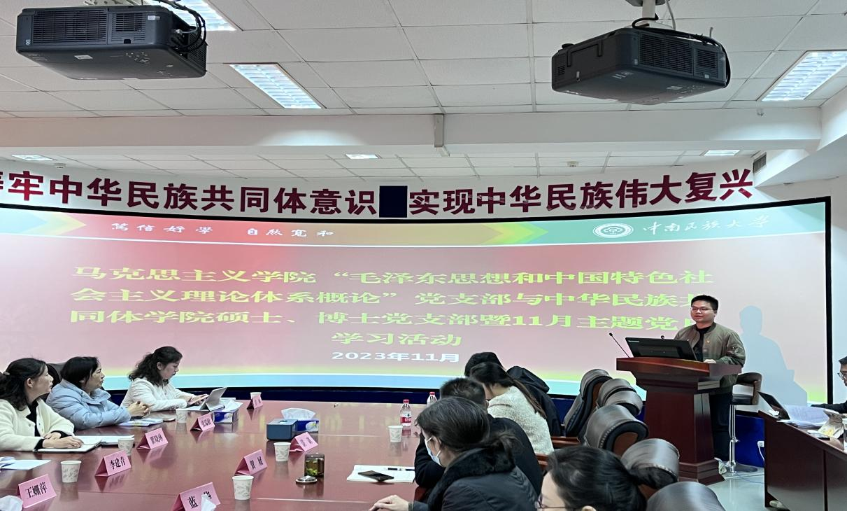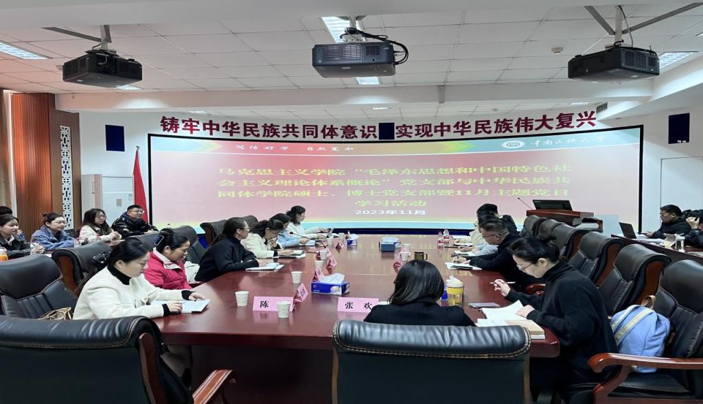 為引導黨員師生進一步學深悟透習近平總書記在二十屆中央政治局第九次集體學習時的重要講話精神,充分發揮黨建引領作用,加強黨支部間的學習交流,實現黨支部建設“優勢互補、互相促進、共同提高”,2023年11月24日,我院碩士、博士研究生黨支部與馬克思主義學院“毛澤東思想和中國特色社會主義理論體系概論”師生聯合黨支部聯合開展“弘揚中華民族精神,鑄牢中華民族共同體意識”主題黨日活動,雙方師生黨員干部共55人參加此次活動。會議由馬克思主義學院副院長、支部書記瞿曉琳主持。