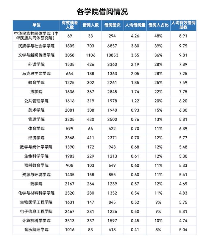 我院借閱人占比位居全校第一名,人均有效借閱冊數位居全校第三名