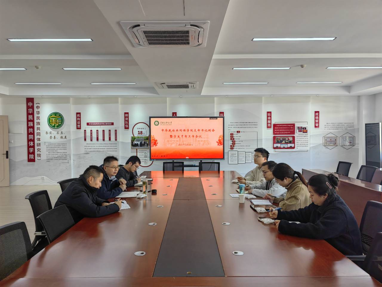最后,賀展部署本學期學生工作,要求持續開展以“鑄牢”為主題的系列活動,包括“石榴花開”讀書分享會、黨團支部聯學共建、“鑄牢”宣講、紅色教育基地參觀實踐活動等。同時,針對學生工作提出四點要求:一是守底線,要規范學生黨支部的日常運行,在黨員發展、獎學金評定等關鍵環節,保證工作的透明度和公正性,確保程序規范、嚴格公平;二是創品牌,要做好一支部一品牌,持續推動和深化已有的品牌活動,如“榴光育才”“石榴花開”“行走田野”等。通過品牌活動,增強學生的凝聚力和學院影響力;三是樹標桿,要培養和樹立優秀學生標桿,提前謀劃并積極發掘有潛力的優秀學生;四是謀發展,要制定并落實學生工作計劃。將學生的自身發展與學院的整體發展緊密結合,確保學生工作與學院的發展相輔相成,形成合力,大力推動學院內涵式發展。